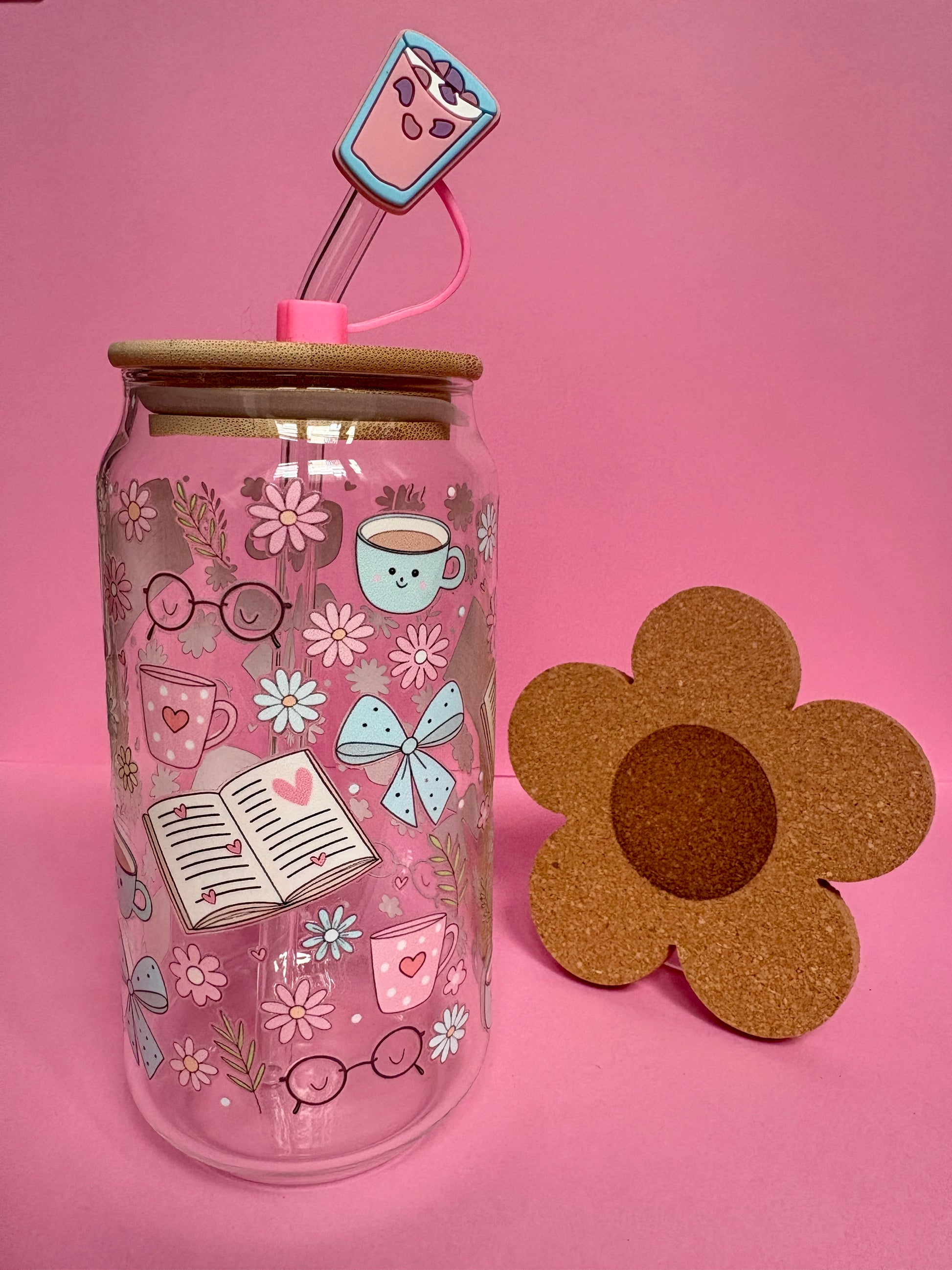 Incluye pajita de vidrio, posavasos y tapĂłn para pajita aleatorio.